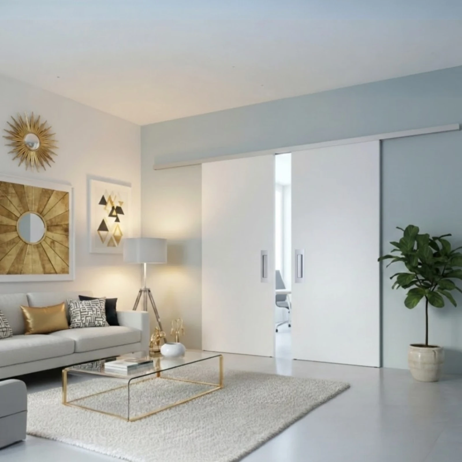 Sistemul In Out Fly Wood este o soluție profesională pentru realizarea ușilor de trecere glisante din lemn, în care greutatea ușii este preluată integral de mecanismul superior, iar partea inferioară are doar rol de ghidare. Rezultatul este o ușă care culisează lin, stabil și silențios, fără prag sau șină vizibilă pe pardoseală.