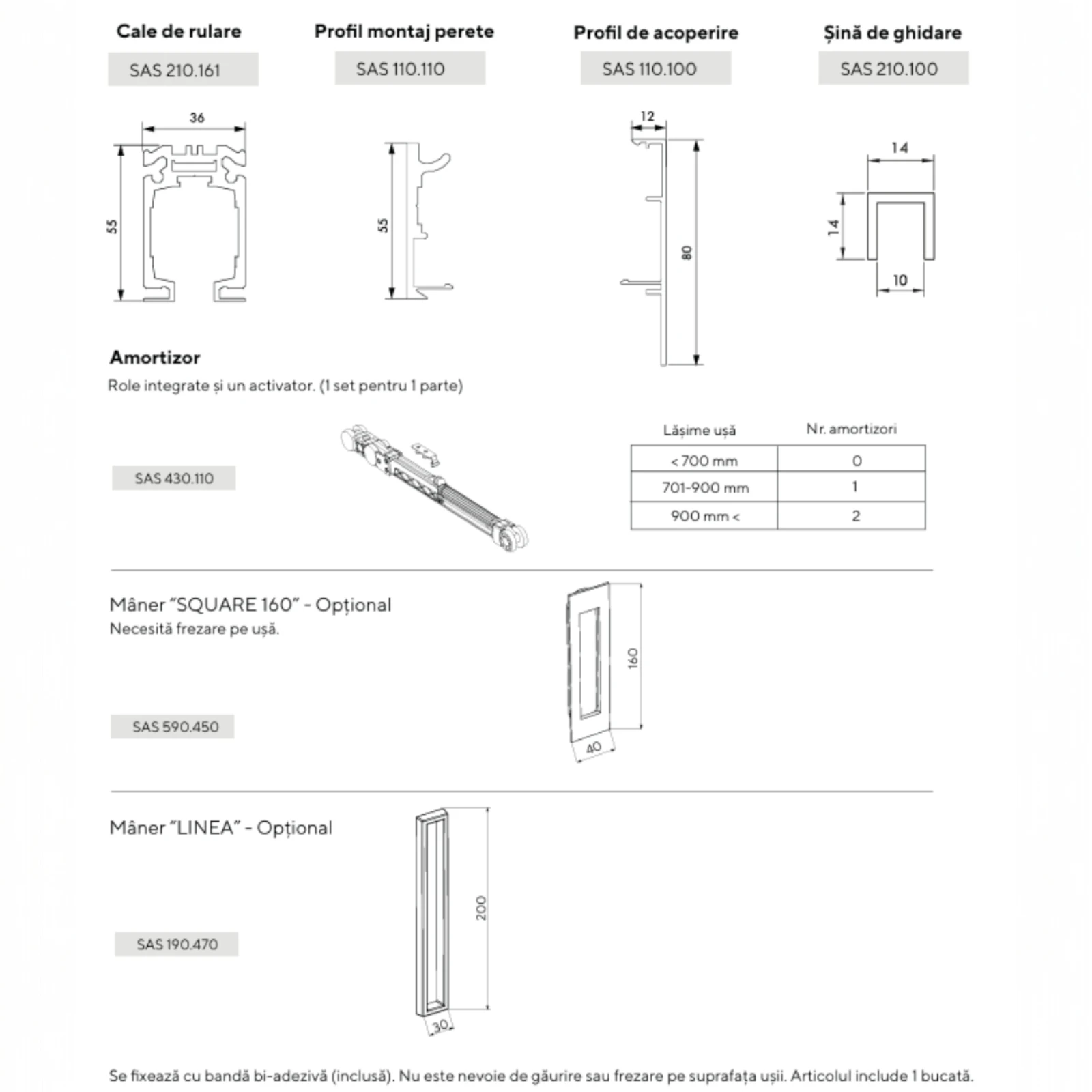 Pentru funcționarea sistemului sunt indicate ca elemente principale șina superioară, seturile de role, șina de ghidaj inferior, setul de montaj ușă și profilul pentru montaj pe perete. Profilul de acoperire este recomandat tehnic, iar amortizarea și acest element de închidere laterală sunt prezentate ca opționale.