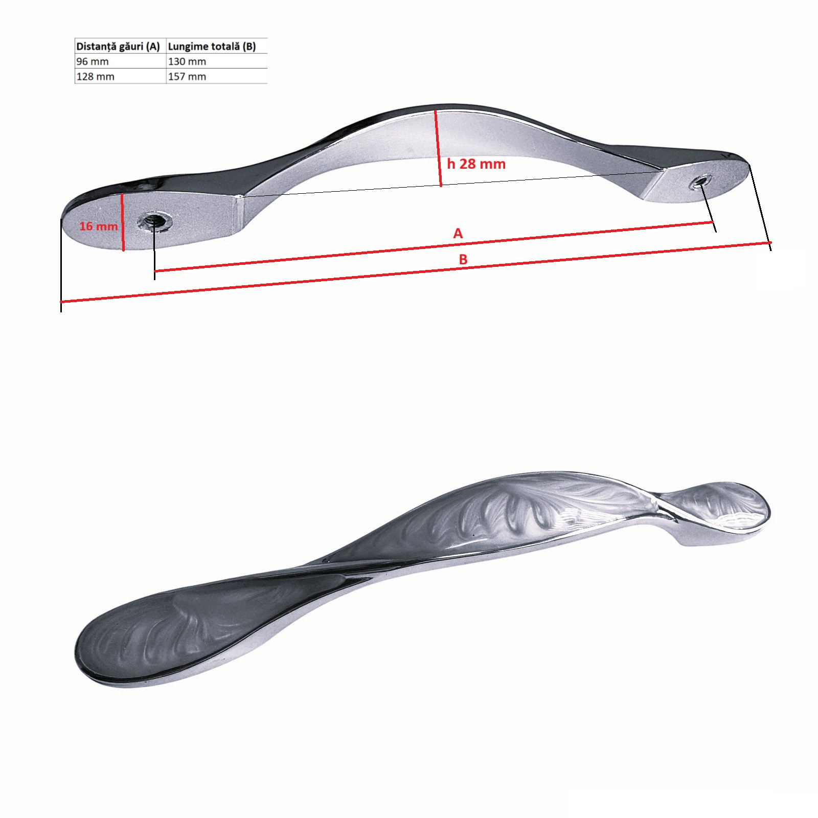 • Dimensiune între găuri (mm): 128 ⇒ Lungime totală mâner (mm): 157;