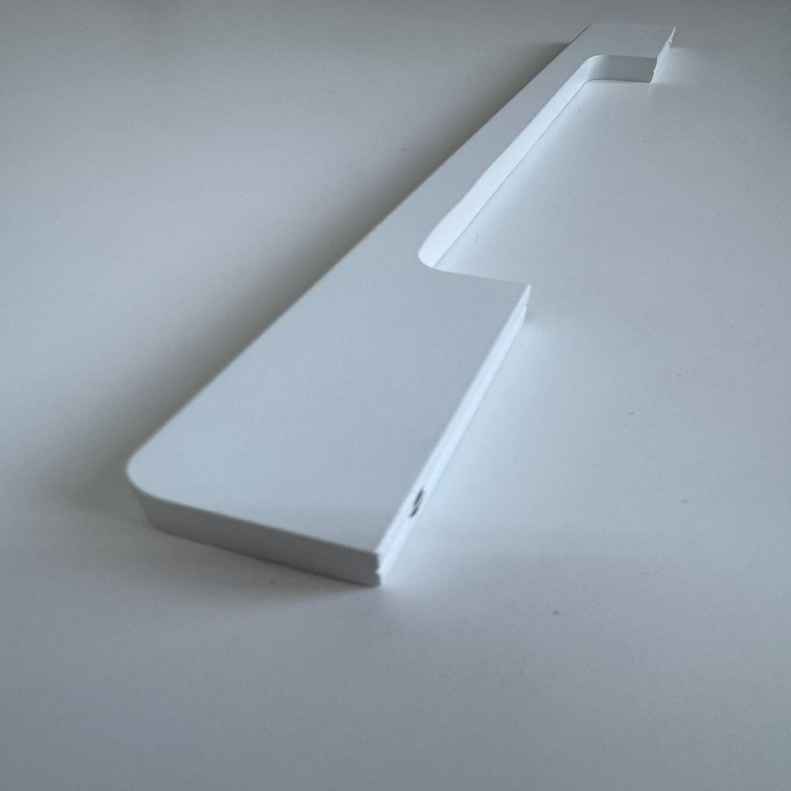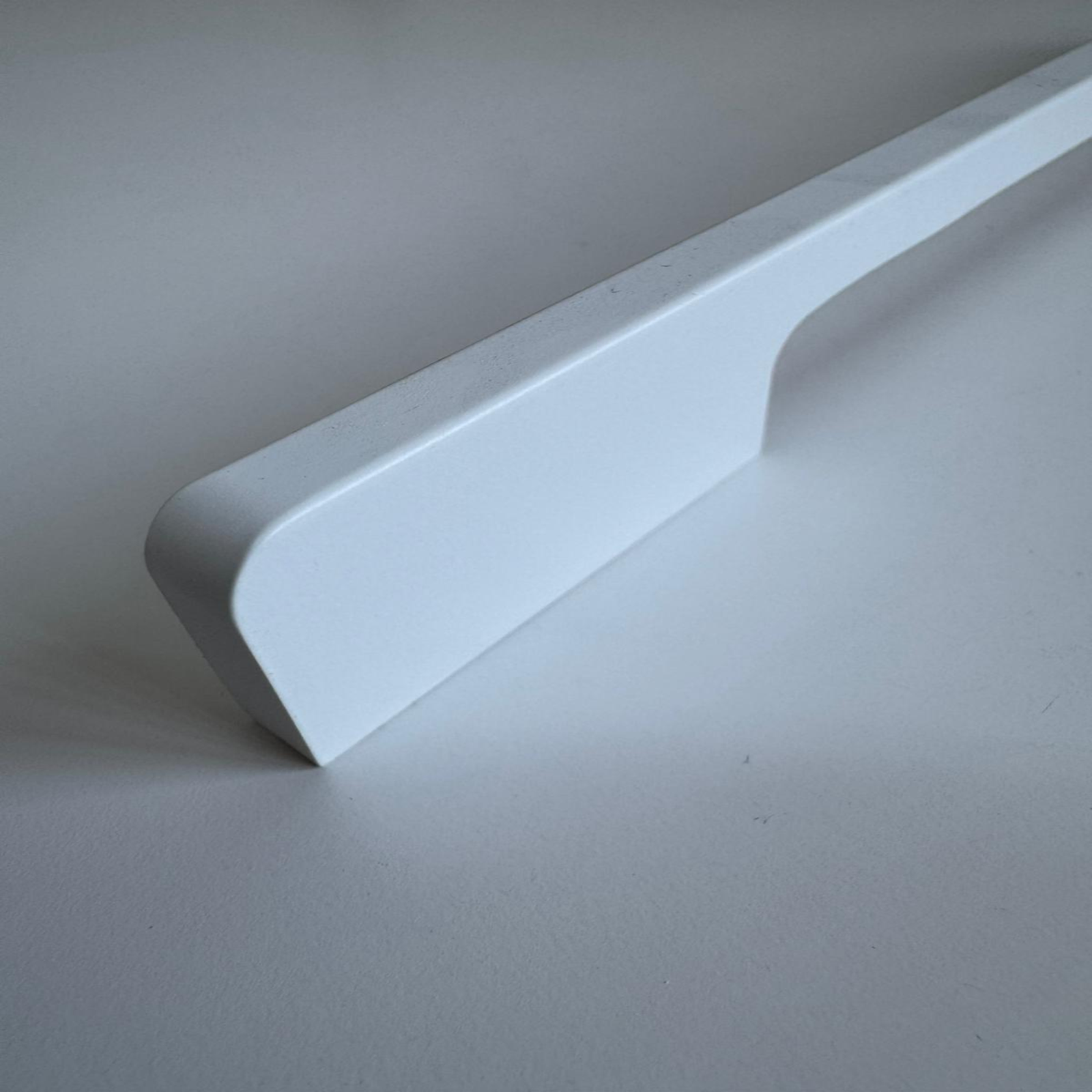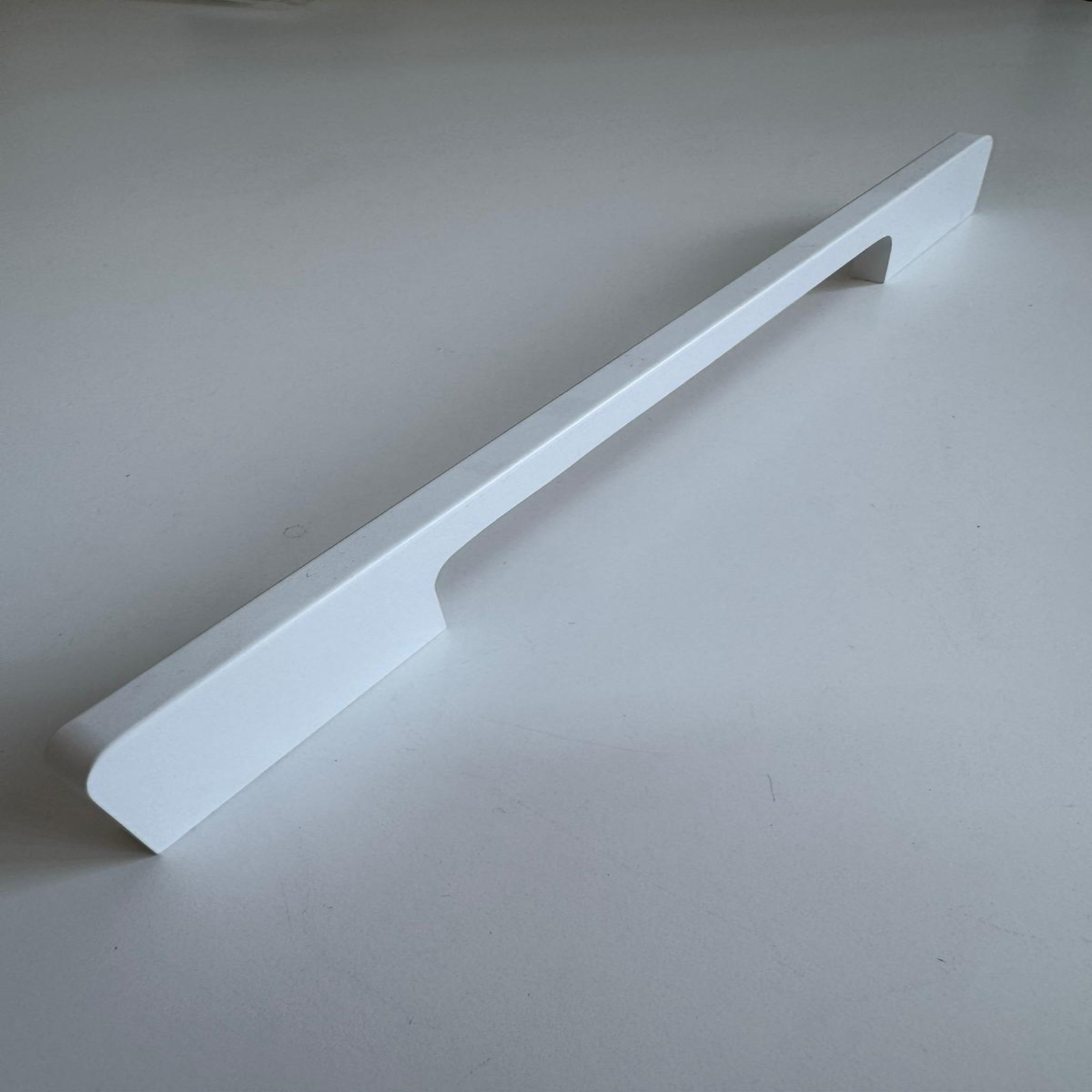 Un mâner aplicat („aplicat” înseamnă că se montează pe fața frontului) , linear, din material metalic, cu finisaj alb, gândit pentru mobilier modern și minimalist.