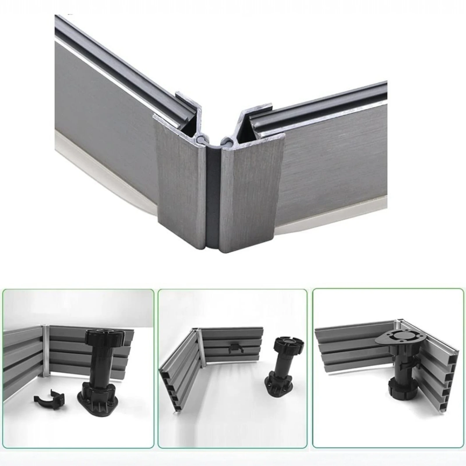 Disponibil în finisaje precum inox, aluminiu, auriu mat, alb mat și negru mat, colțarul se potriveste cu orice tip de plintă și adaugă un plus de eleganță încăperii.