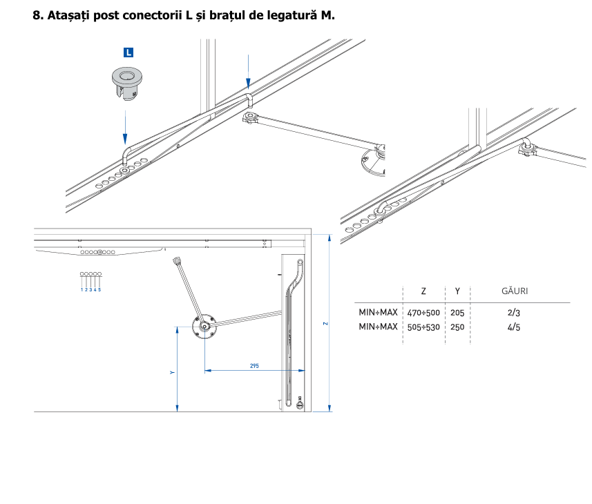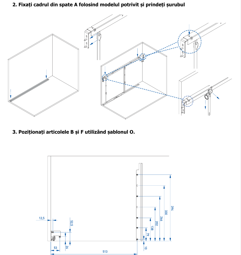 Sistemul poate fi montat atât pe dreapta cât și pe stânga, recomandabil pe corpuri de mobilier cu dimensiunile de l 90cm x A 52cm x H 65cm.